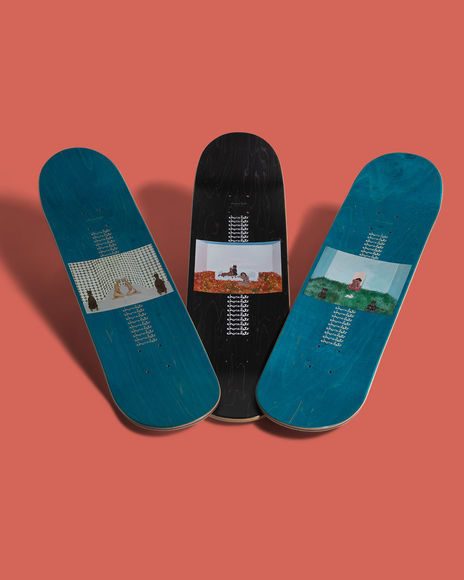 Chocolate Deck L8RGRL Doberman Carl Aikens 8.5". The design features an acrylic painting titled "Inside Outside". The painting is a surrealist expression of themes of isolation and growth brought about by the 2020 Pandemic Shutdown